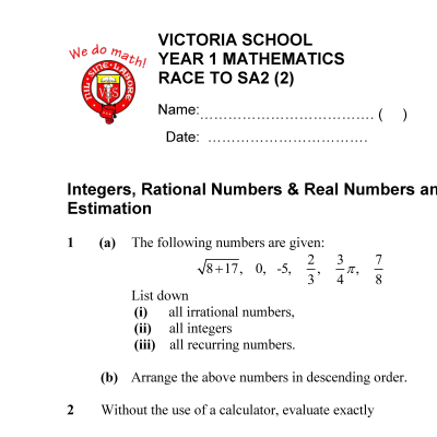 RGS Year 1 IP (Sec 1 Integrated Programme) Mathematics Exam Papers (soft copy)